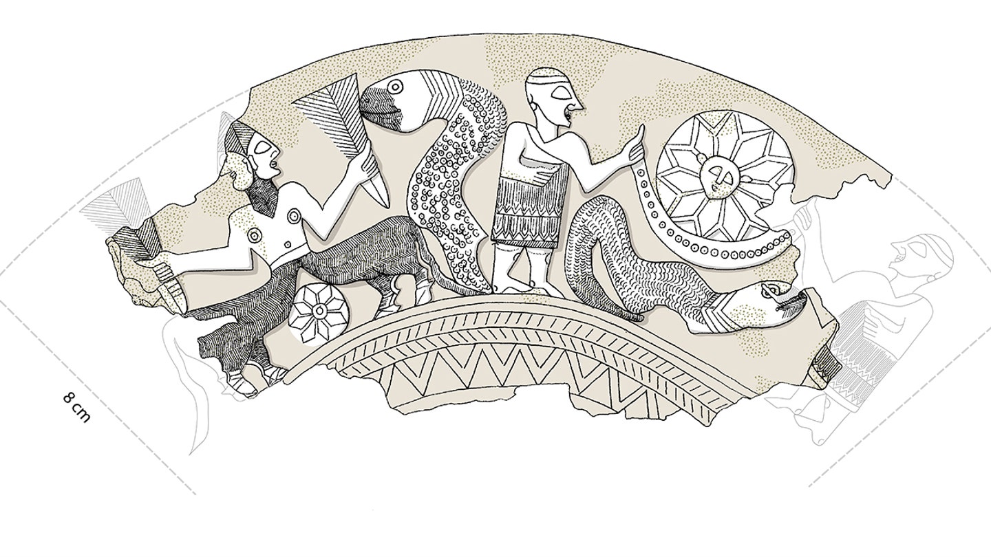 “We interpret the arch held by the two figures on the right as a celestial boat,” he stated, citing related artwork from Mesopotamia, Egypt and Anatolia.