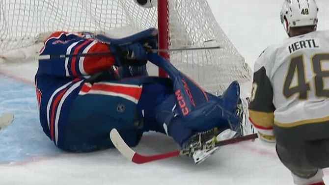 Stuart Skinner makes a wonderful stick save to maintain the sport tied 2-2 for the Oilers vs. the Golden Knights.
